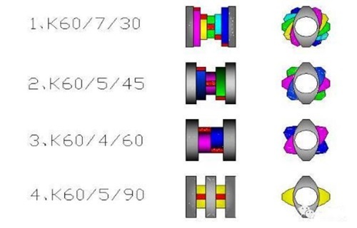 ● 在進(jìn)行聚合物混合時(shí),喂料塑化混合段由一個(gè)或兩個(gè)中等寬度甚至更寬的右旋嚙合盤(pán)以及平直嚙合塊KB組成,而整段還含有一個(gè)或者兩個(gè)左旋螺紋嚙合塊;