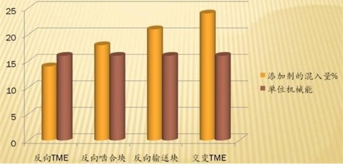 ● 用嚙合塊結構的螺桿能混入添加劑的量小于任何一種TME結構螺桿;
