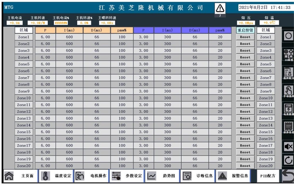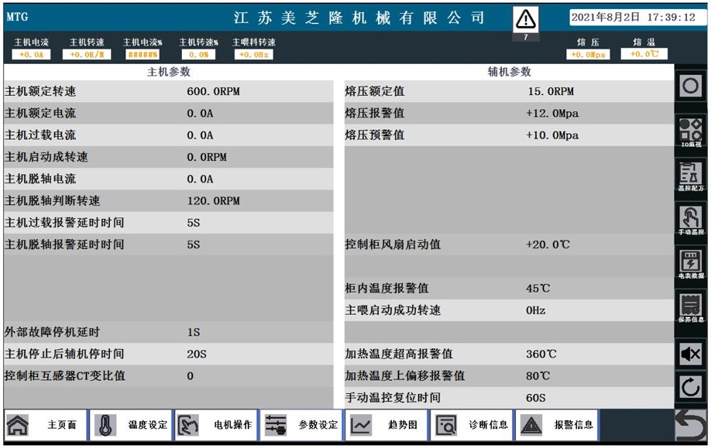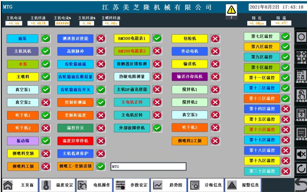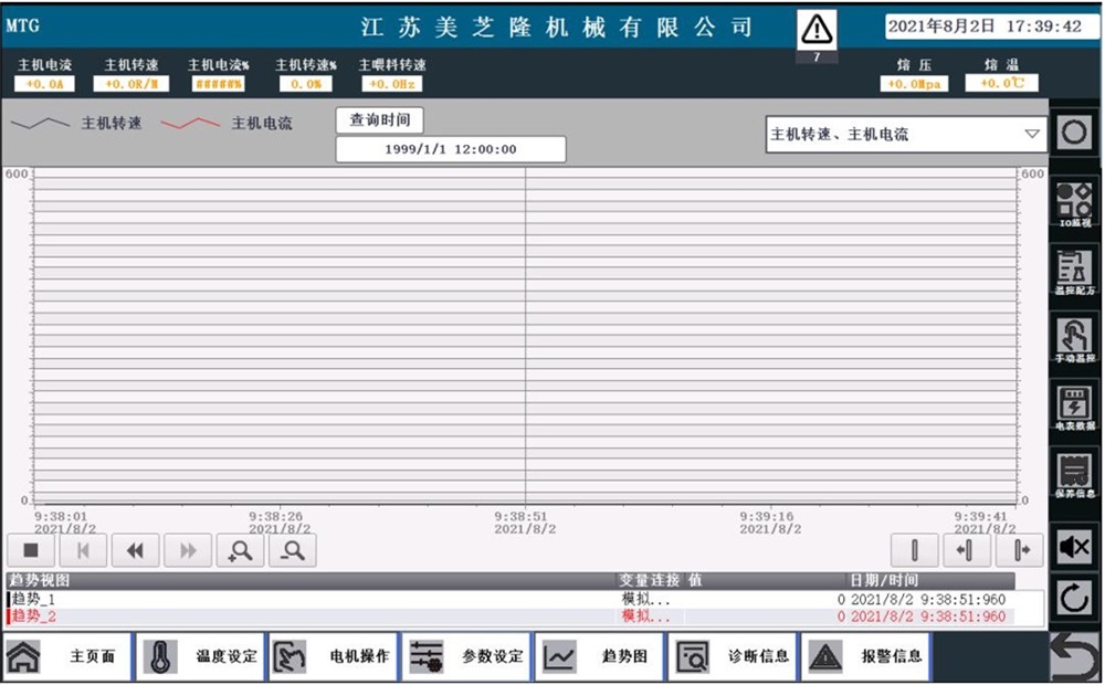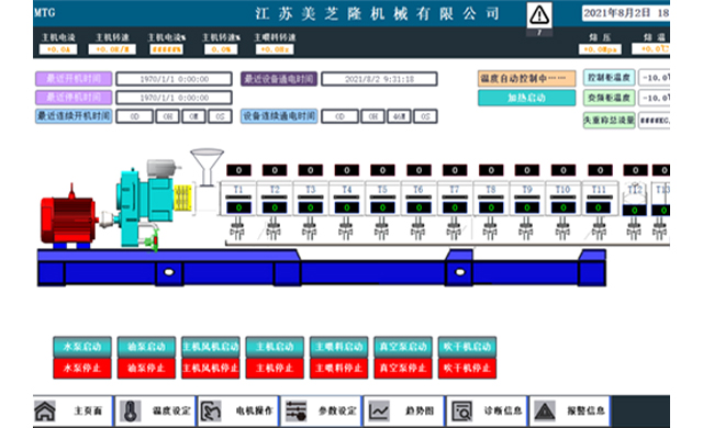 ● 在主機觸摸屏上監控主機轉速、主機電流、各段溫控設定值和實(shí)際值、熔體壓力實(shí)際值等,并有動(dòng)態(tài)曲線(xiàn)顯示、參數輸入、參數保存;故障報警優(yōu)先顯示,報警信息可記錄和調閱