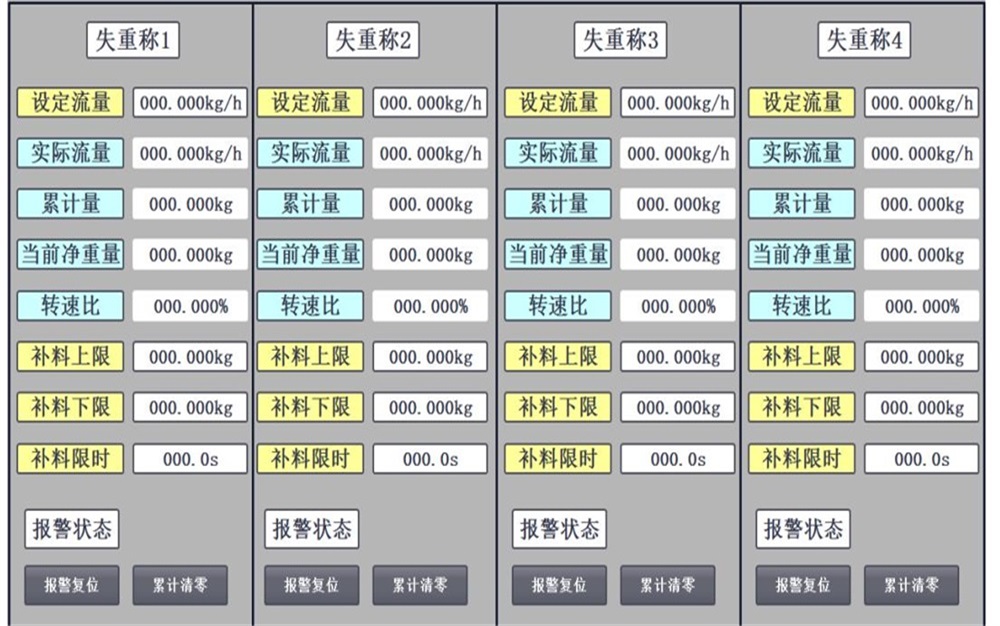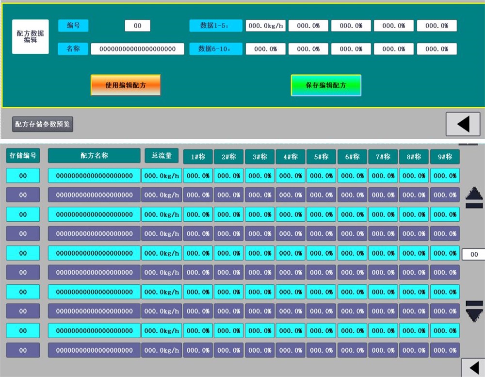 ● 具備物料配方管理功能,在觸摸屏上可調用、增加生產(chǎn)配方,生產(chǎn)人員只需要選取生產(chǎn)的配方號,輸入生產(chǎn)小時(shí)產(chǎn)量,就能自動(dòng)計算出需要參與的每臺稱(chēng)的運行參數,并把以上數據給予對應的失重稱(chēng),實(shí)現一鍵開(kāi)機。
