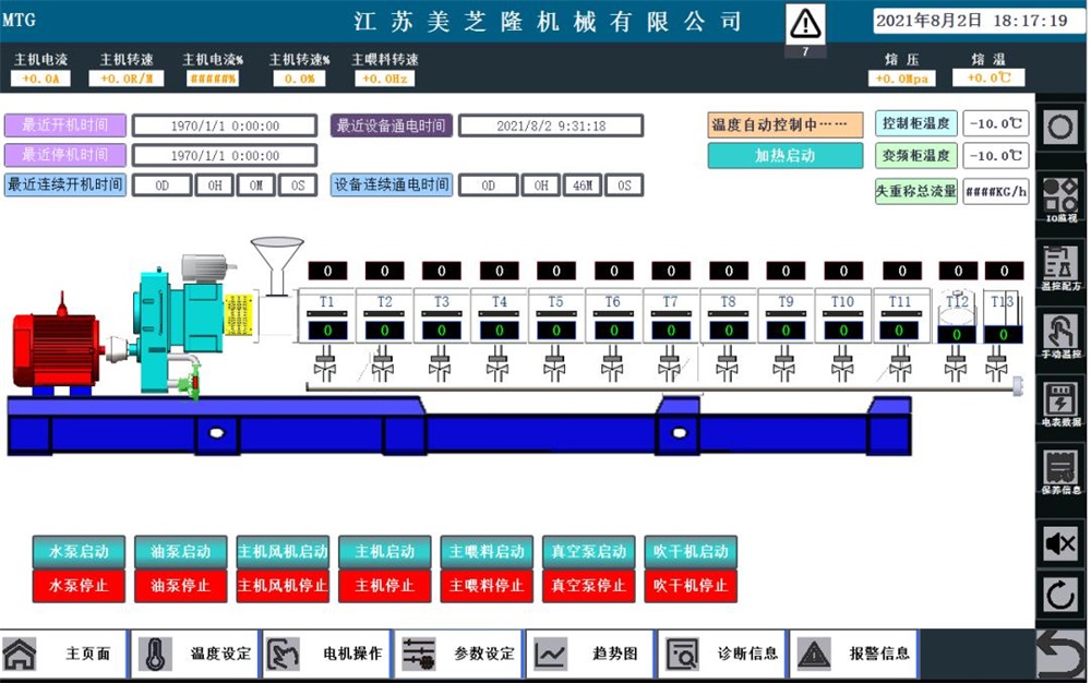 ● 采用西門(mén)子TP1200觸摸屏,12寸真彩,高對比度,高壽命,高靈敏度操作;可在擠出機觸摸屏上實(shí)現主機、失重稱(chēng)、輔機的啟停、參數設定和運行狀態(tài)監控。